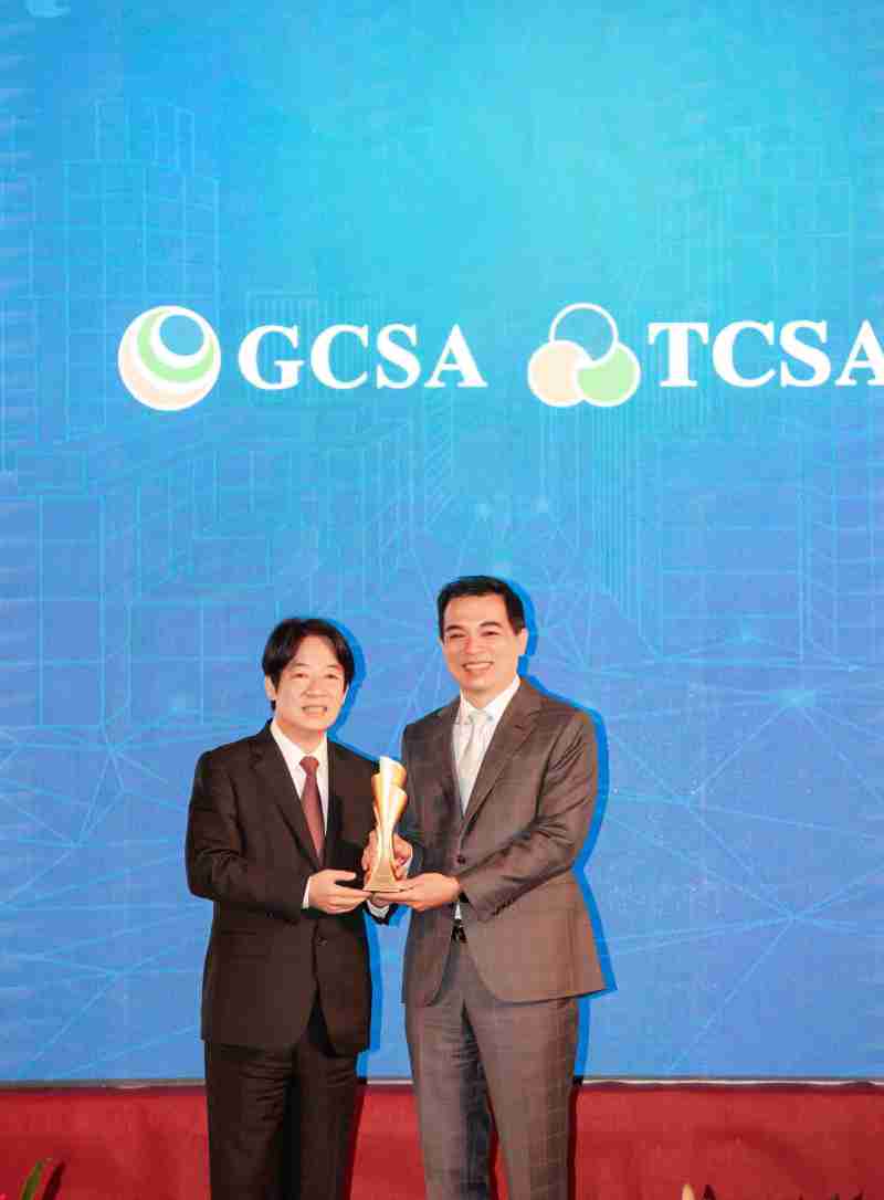 达全方位永续表现获全球永续奖及台湾永续奖肯定,,,,由副总统赖清德颁奖 (左),,CG电子总经理柯富仁 (右) 代表领奖