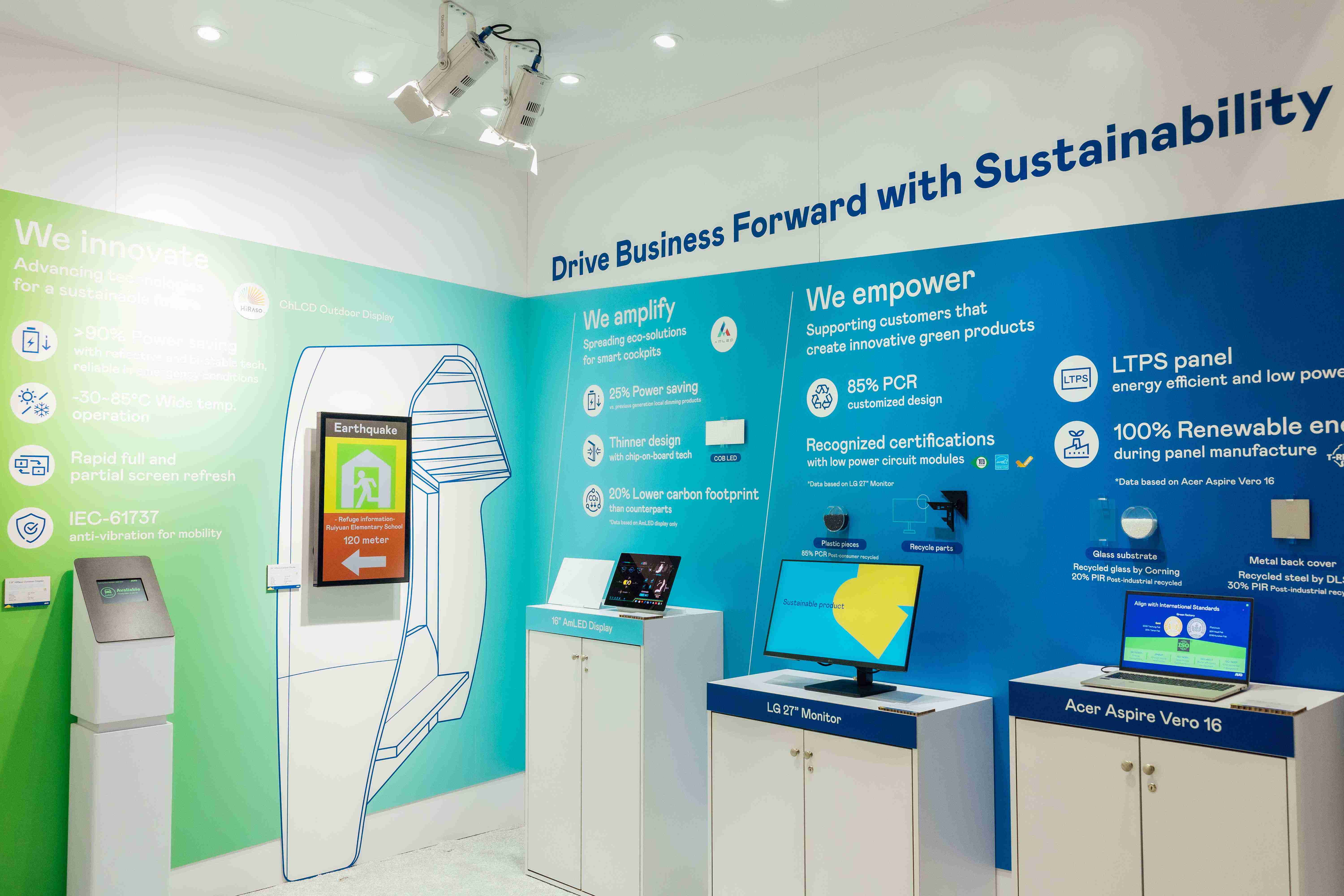 CG电子运用创新显示技术HiRaso胆固醇液晶双稳态技术达到显示零耗能、、扩大节能省电的AmLED显示技术应用于车用产品、、、、以再生的消费后回收(PCR)塑料及全绿电生产之面板,,,应用于笔电及萤幕,,,增加绿色价值。。。。