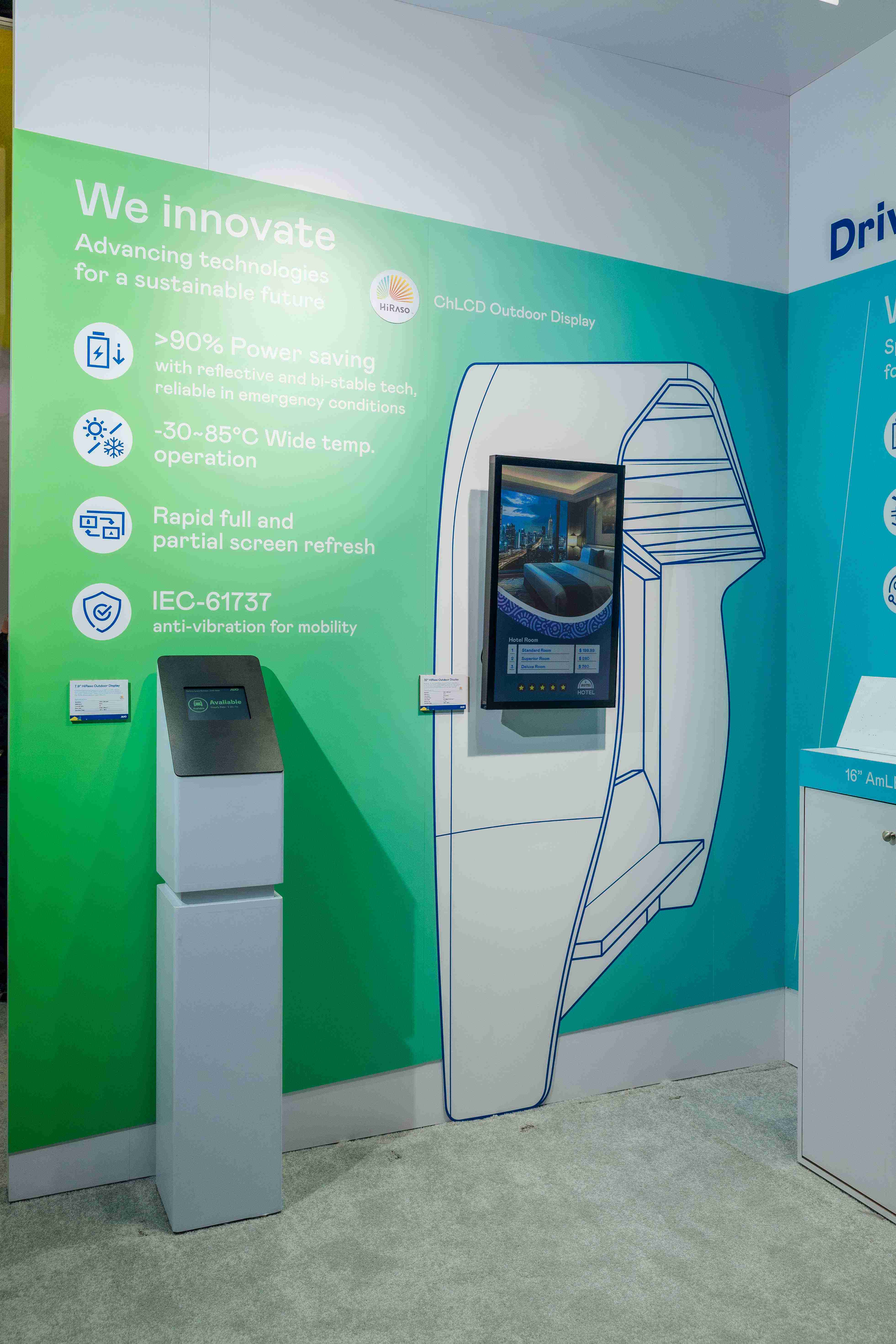 HiRaso胆固醇液晶显示器运用反射环境光线的方式,,,呈现影像显示时零耗能的环保省电诉求,,光线愈强愈能呈现绝佳的色彩饱和度及显示效果,,同时在摄氏-30度至85度间宽温的使用优势,,,,为户外电子看板的新首选。。。。